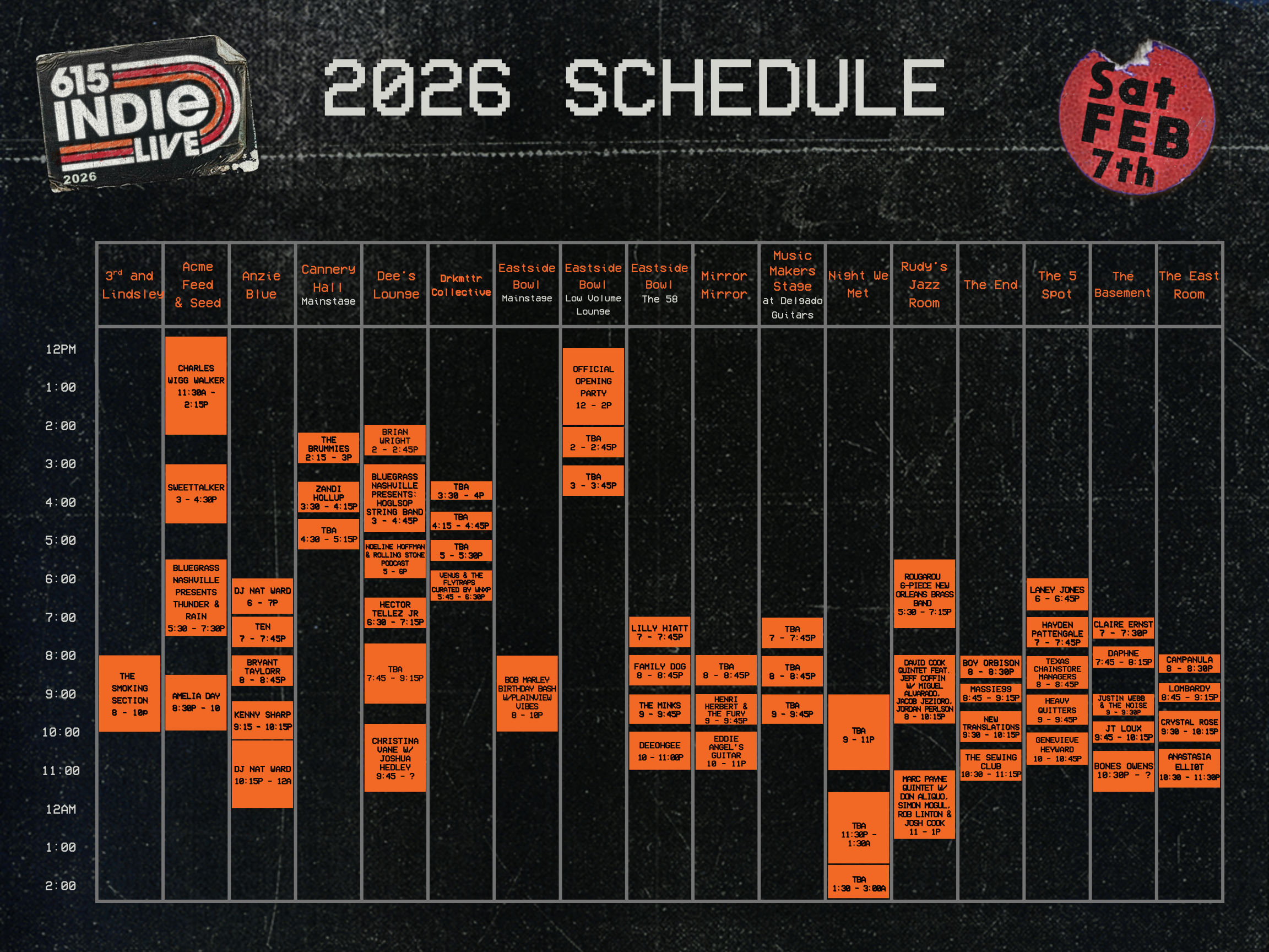 Amelia Day • Anastasia Elliot • Bones Owens • Boy Orbison • Brian Wright • Bryant Taylorr • Campanula • Charles Wigg Walker • Claire Ernst • Christina Vane with Joshua Hedley • Crystal Rose • Daphne • David Cook Quintet feat. Jeff Coffin w/ Miguel Alvarado • Jacob Jezioro & Jordan Perlson • DeeOhGee • DJ Nat Ward • Eddie Angel’s Guitar Party • Family Dog • Genevieve Heyward • Hayden Pattengale • Heavy Quitters • Hector Tellez Jr • Henri Herbert and The Fury • Hogslop String Band • Hussy Fit • JT Loux • Justin Webb & The Noise • Kenny Sharp • Laney Jones and The Spirits • Lilly Hiatt • Lilly Winwood • Lombardy • Marc Payne Quintet w/ Don Aliquo • Simon Mogul • Rob Linton & Josh Cook • Massie 99 • New Translations • Plainview Vibes’ Bob Marley Birthday Bash • Rolling Stone Nashville Now with Noeline Hofmann • Rougarou • SWEETTALKER • TEN • Texas Chain Store Managers • The Brummies • The Minks • The Sewing Club • Thunder and Rain • Venus & the Flytraps • Zandi Hollup
